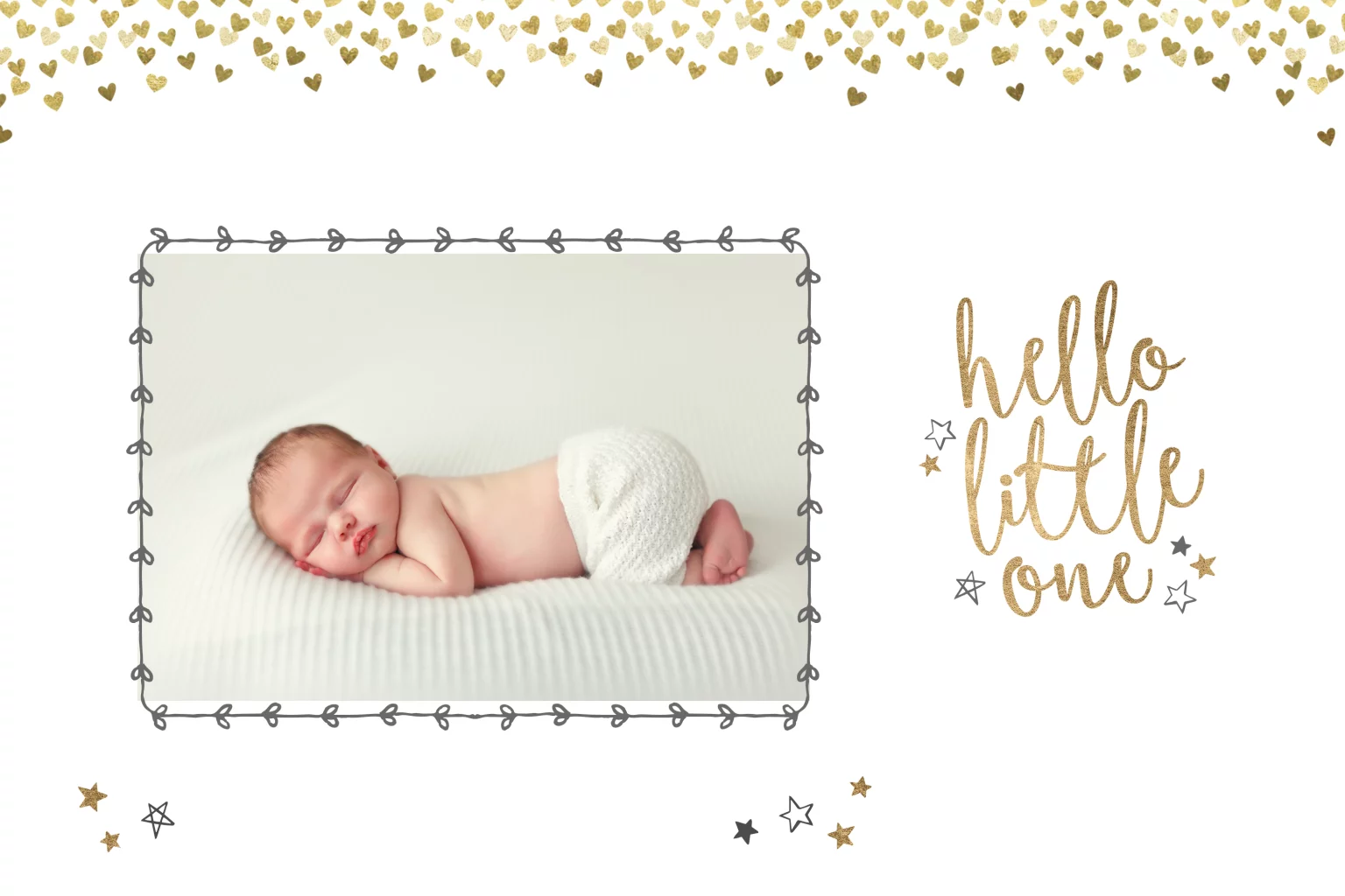 Een geboortekaartje met foto van jullie kindje en goud- en zilverkleurige details. Met de tekst Hello little one en goudkleurige hartjes en sterren.
