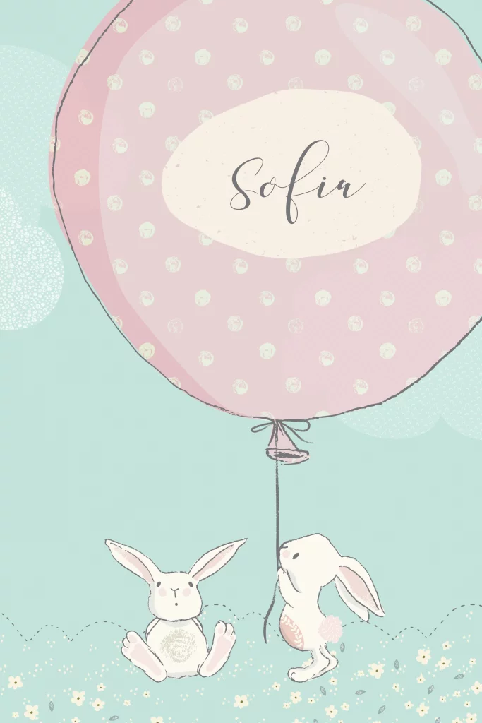 Geboortekaartje met lief konijntje met ballon in roze en mint