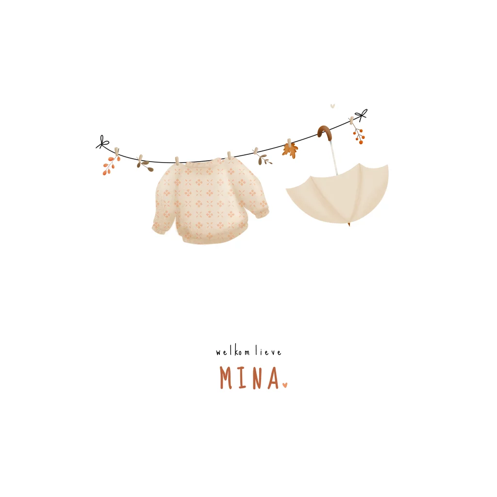 Op zoek naar een schattig geboortekaartje voor jullie dochtertje? Ons vierkante geboortekaartje met een liefelijk ontwerp van kleertjes aan een waslijn en een paraplu is perfect voor de aankondiging van de geboorte van jullie meisje.