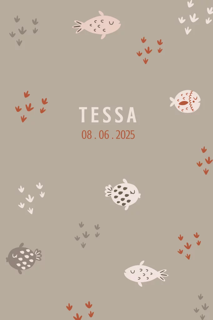 Leuk geboortekaartje met elementen uit de onderwaterwereld. Dit geboortekaartje met zeedieren is in trendy aardetinten maar de kleuren kun je eenvoudig naar wens aanpassen in de editor.