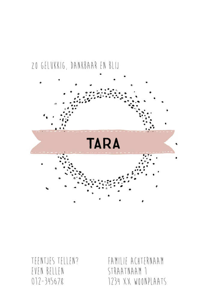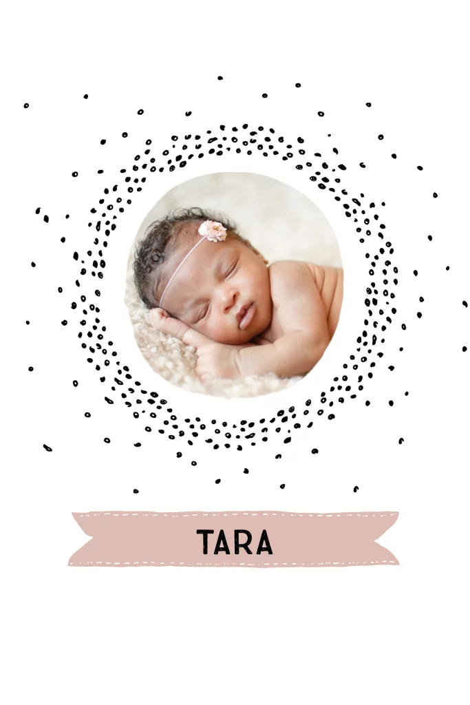Een hip geboortekaartje met foto van jullie eigen dochter. In roze, zwart en wit. Met geboorte-icoontjes en de naam van jullie kleine spruit in een roze banner. Dit geboortekaartje is ook verkrijgbaar in mintgroen of blauw.