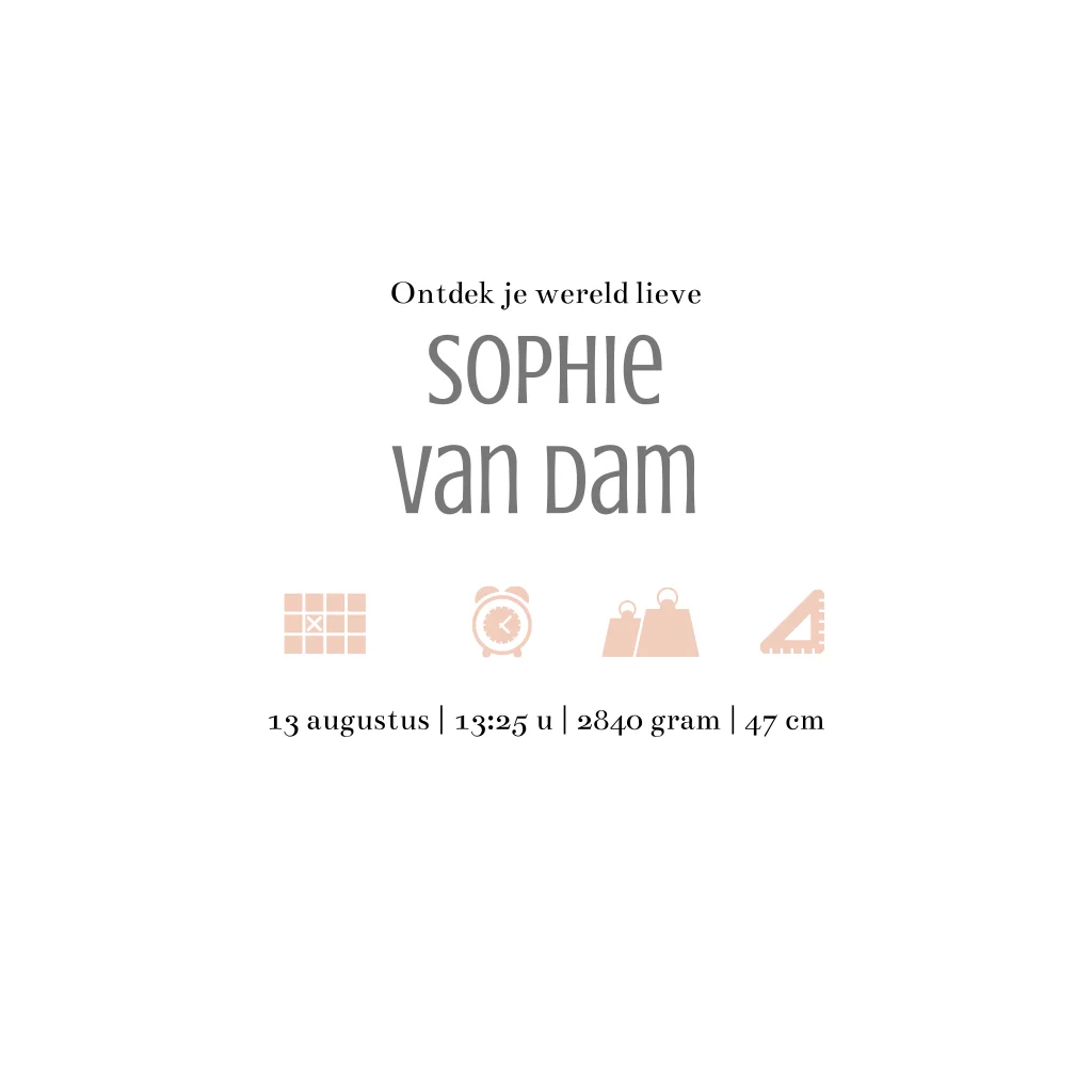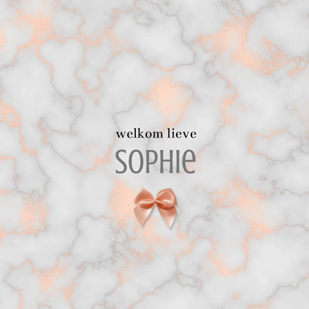 Een klassiek en stijlvol geboortekaartje met marmer en peach accenten. Het strikje op dit kaartje wordt niet afgedrukt, deze is alleen als voorbeeld. Op die plek kun je straks zelf het echte strikje plakken die je er apart bij bestelt.