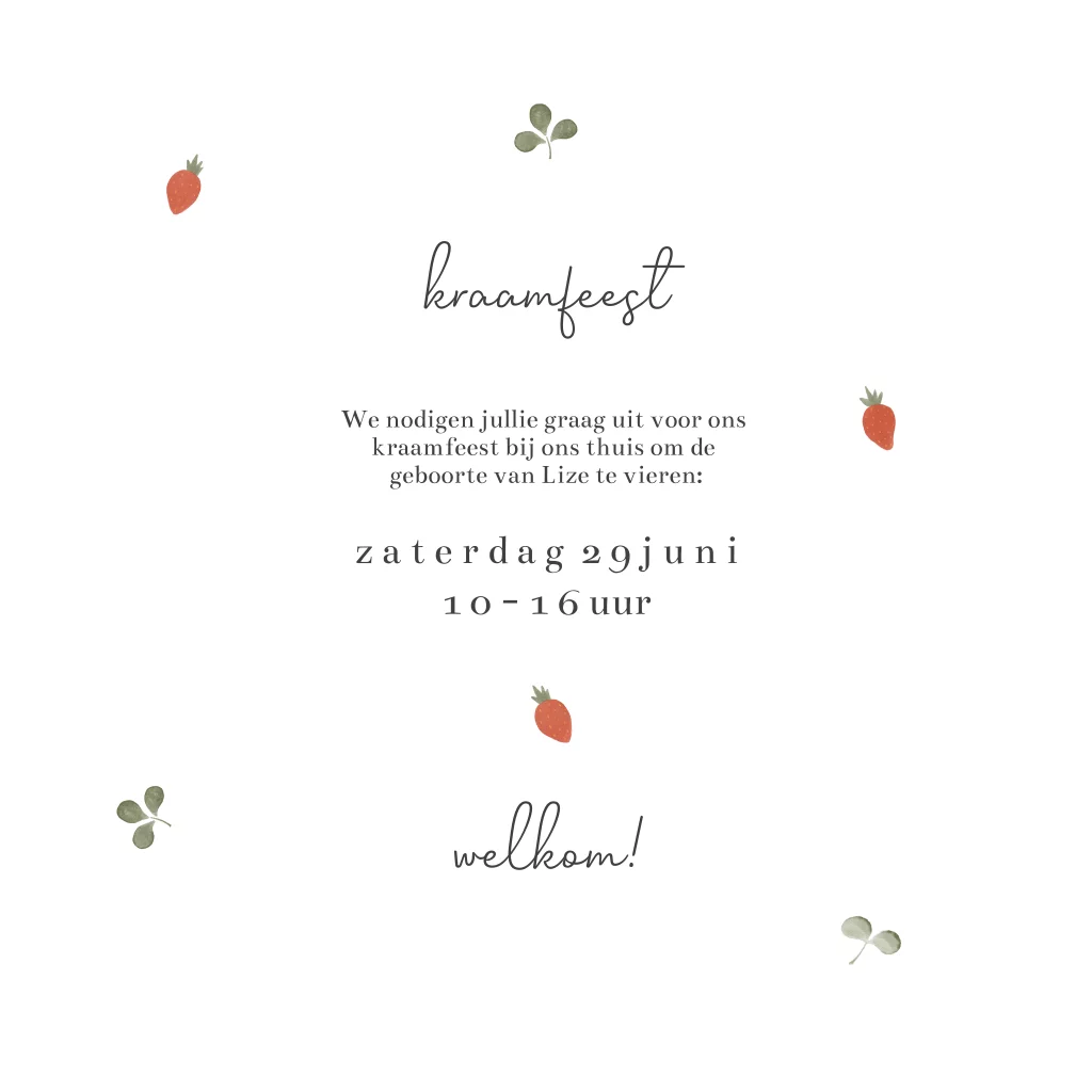Kraamborrelkaartje kraamfeest aardbeitjes en blaadjes