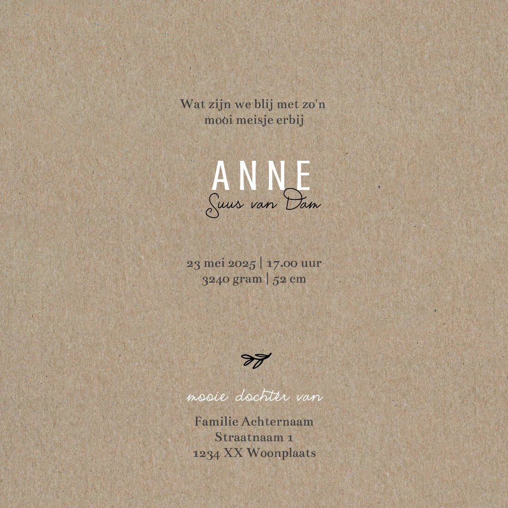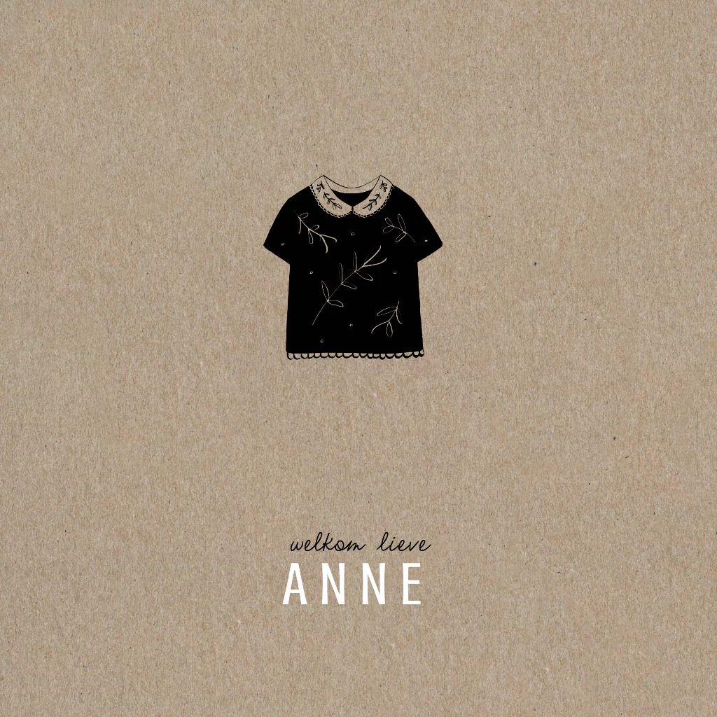 Lief geboortekaartje op kraftpapier voor een meisje met illustratie van een truitje op de voorzijde. Pas de teksten, kleuren en lettertypes eenvoudig aan.