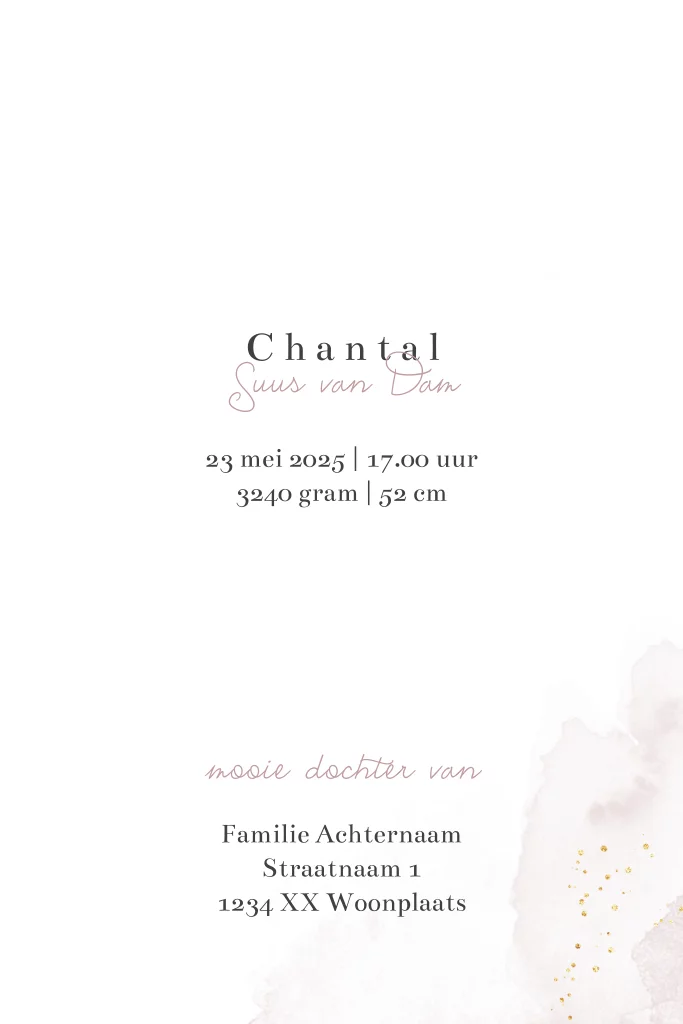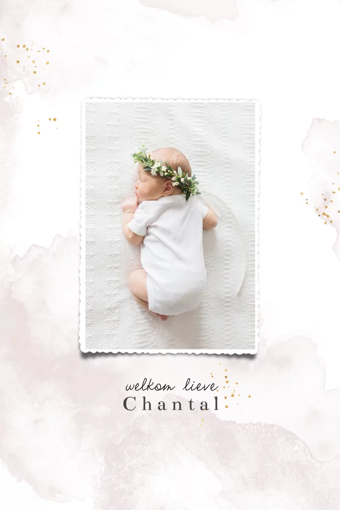 Een lief geboortekaartje met foto om jullie kindje op een originele manier aan te kondigen bij jullie familie en vrienden. Met roze waterverf en goudkleurige glitters. Ook verkrijgbaar in groen.