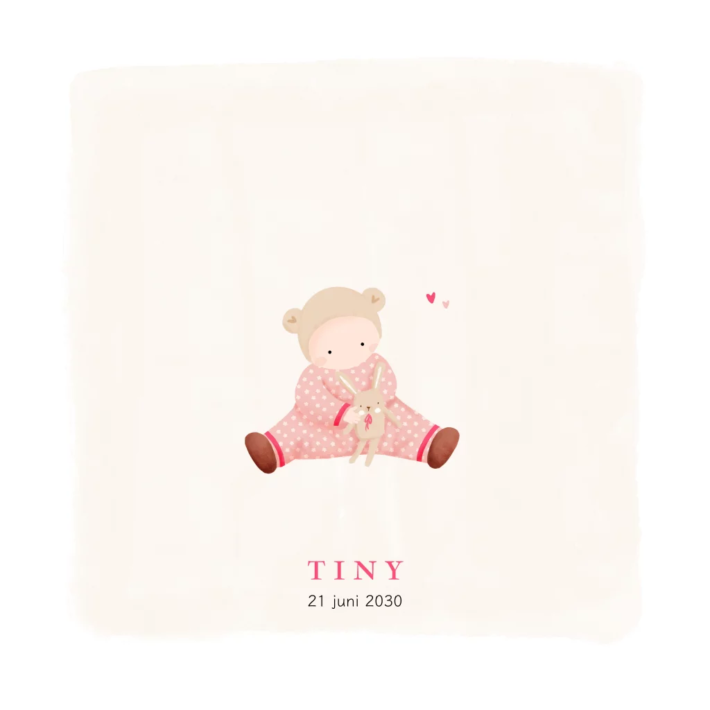 Dit lieve geboortekaartje heeft een schattige illustratie van een lief meisje in roze pyjama met een speelgoedkonijn. Pas het kaartje eenvoudig aan naar jouw wensen!
