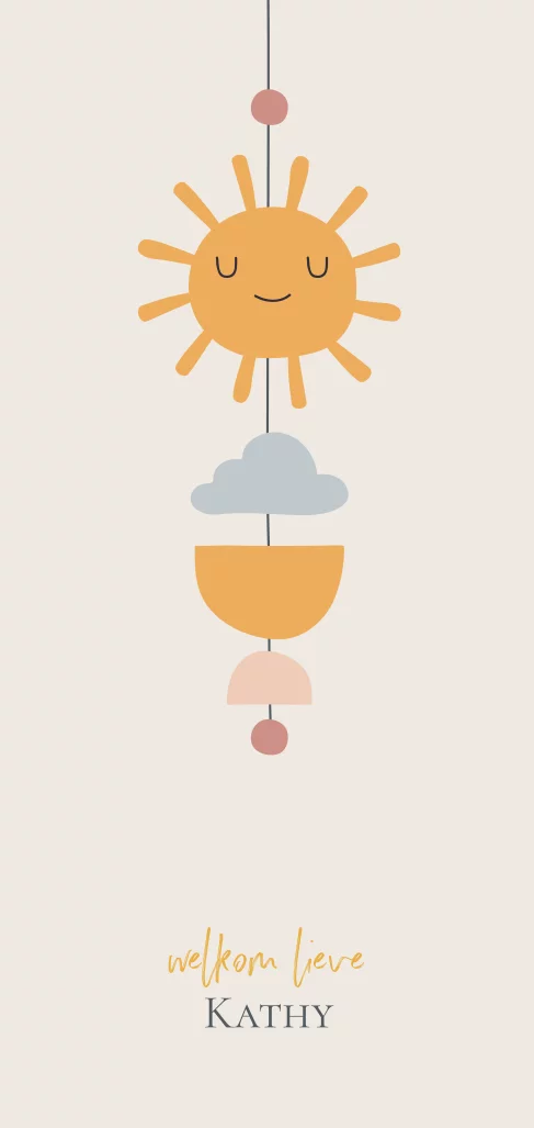 Lief geboortekaartje voor een meisje met op de voorzijde een hanger met zonnetje en wolkje.