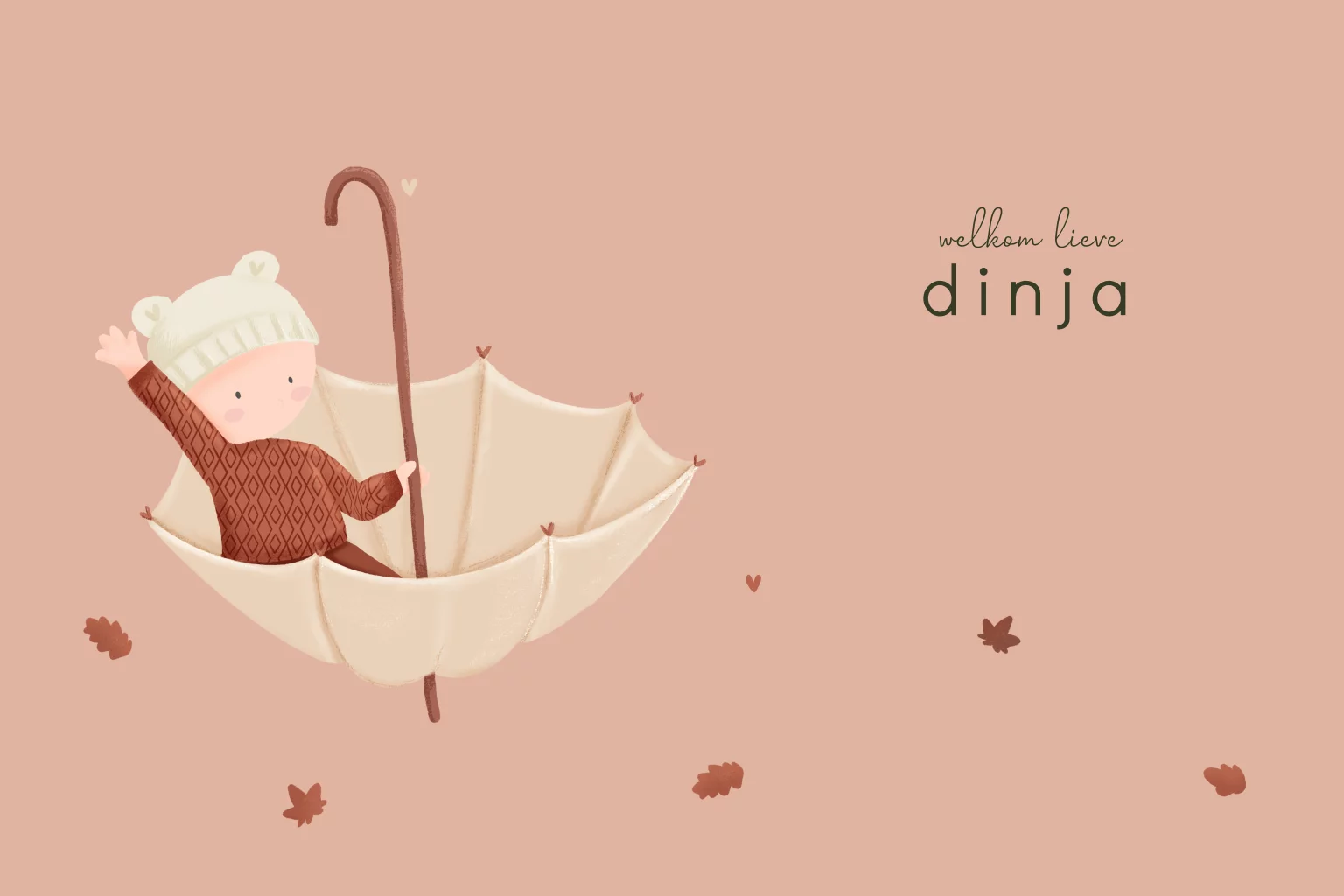 Een lief geboortekaartje met een schattige illustratie van een meisje in een paraplu te midden van vallende herfstblaadjes. Het kaartje is een originele manier om de geboorte van jullie dochter aan te kondigen tijdens de herfst. Pas het kaartje in de editor aan naar je eigen wensen. Kom je er niet uit of mis je elementen in de beeldbank? Neem contact met ons op, wij helpen je graag!