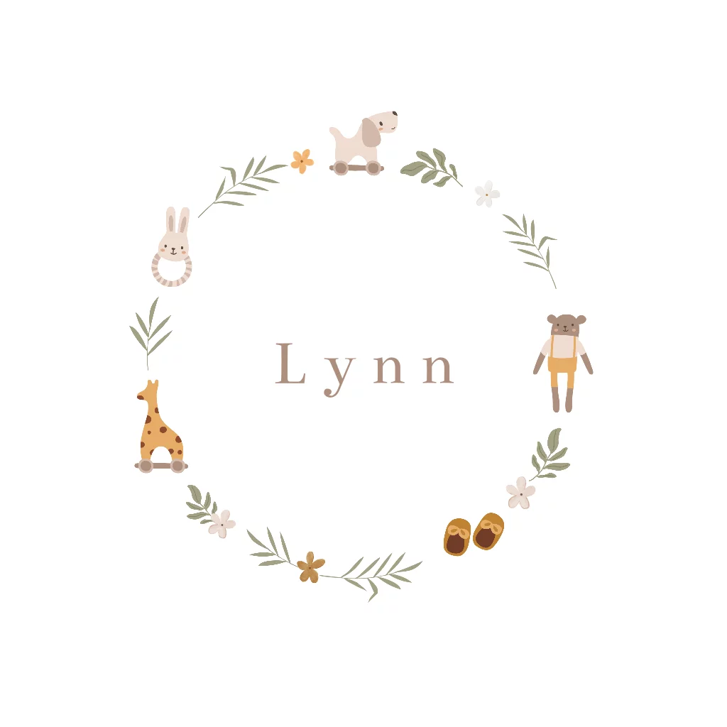 Een lief geboortekaartje voor een meisje met illustraties van speelgoed, knuffels, bloemetjes en takjes. Alles is nog helemaal aan te passen in de online editor, zodat het kaartje helemaal wordt zoals jij graag wilt.