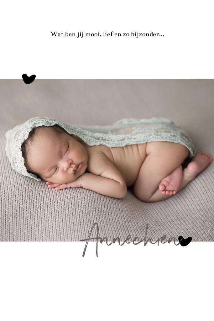 Lief geboortekaartje met foto en hartjes