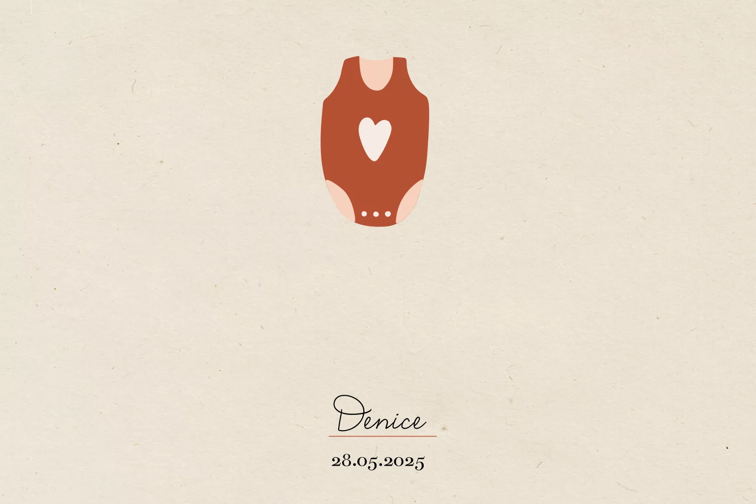 Een lief en minimalistisch geboortekaartje om de geboorte van jullie kleintje aan te kondigen. Met rompertje in roestbruin met een lief hartje en drie knoopjes. Ook verkrijgbaar met groen of blauw rompertje.