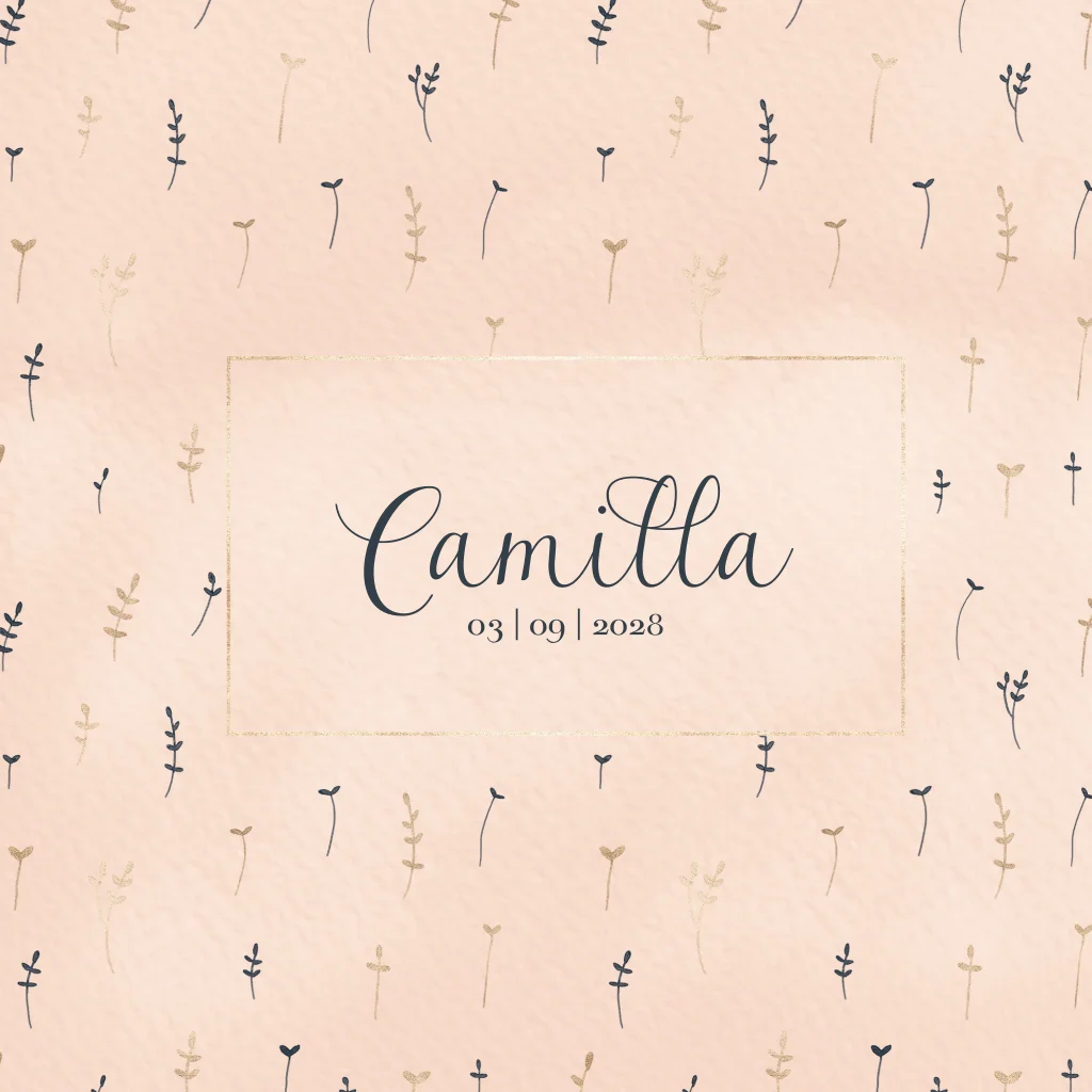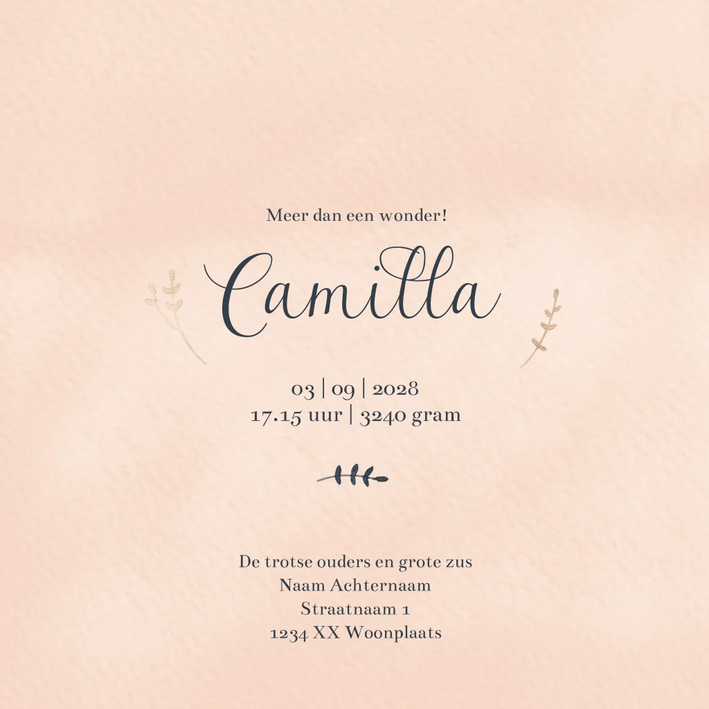 Een lief meisjesgeboortekaartje in waterverf in de kleuren blush en navy blauw met goudkleurige accenten. Aan de binnenzijde is een fotokader waar je een mooie, vierkante foto van jullie kindje(s) kunt plaatsen. Een heel persoonlijke en originele manier om jullie baby voor te stellen aan jullie familie en vrienden.