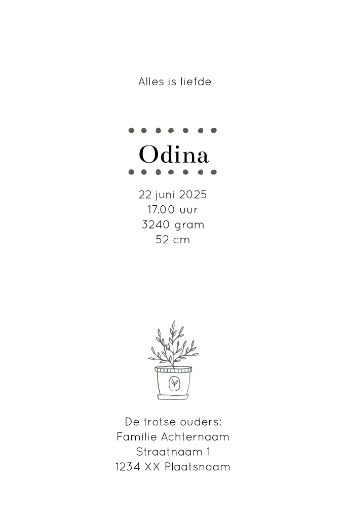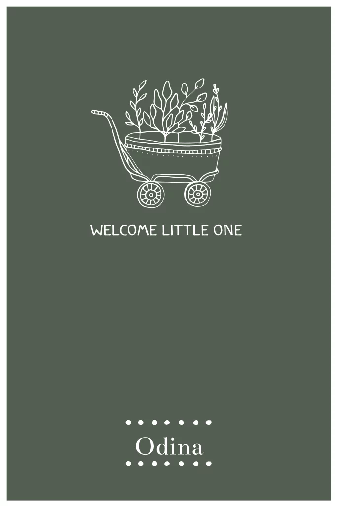 Een stijlvol geboortekaartje om de geboorte van jullie zoon of dochter aan te kondigen. Aan de binnenzijde kun je een foto van jullie kindje plaatsen. De donkergroene achtergrondkleur en de kleur van het wagentje met bloemetjes kun je eenvoudig aanpassen naar wens.