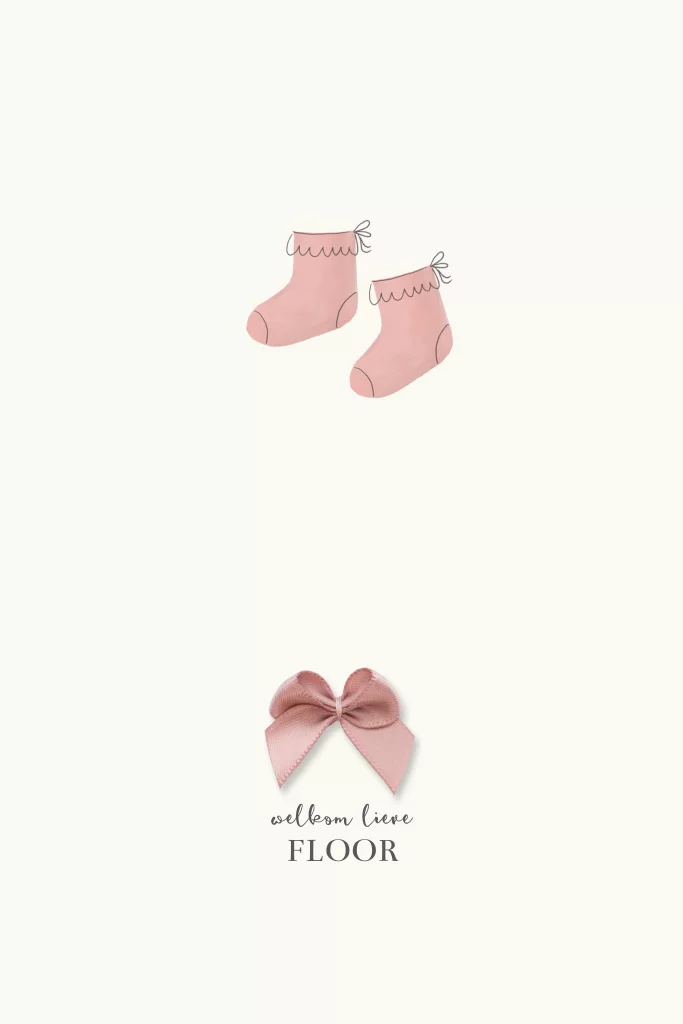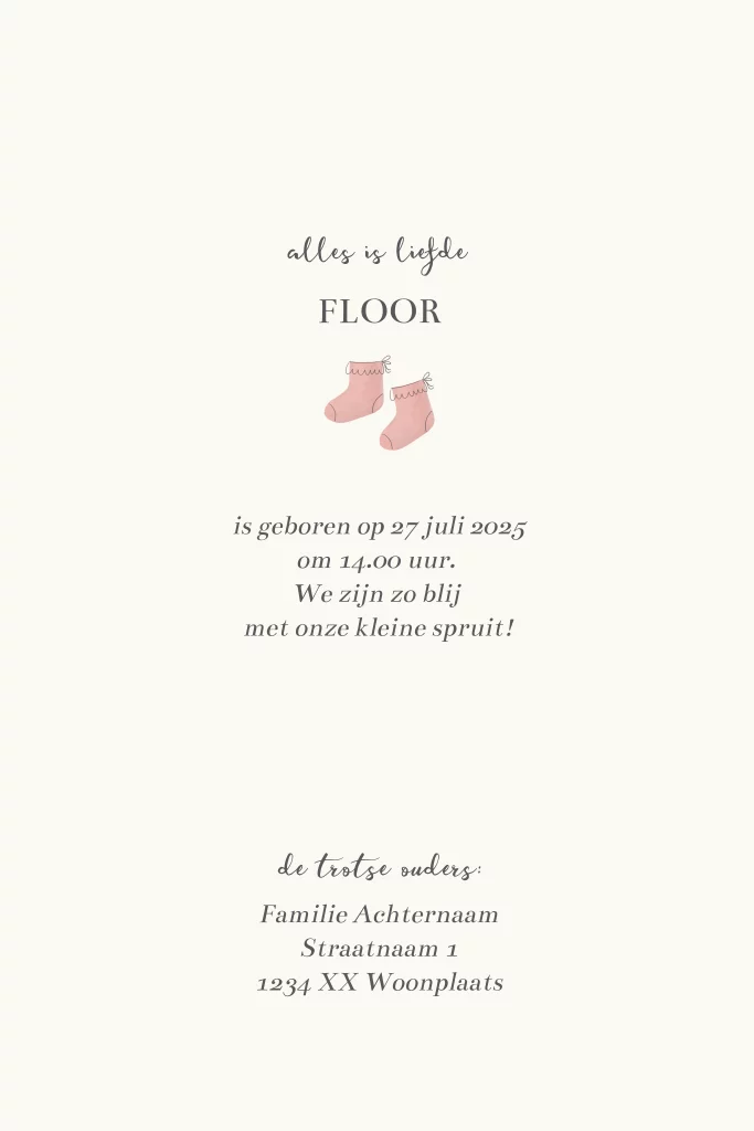 Een lief meisjesgeboortekaartje om de geboorte van jullie dochter aan te kondigen. Met op de voorzijde schattige roze babysokjes. Liever een andere kleur? Stuur ons even een berichtje met je wensen. Het strikje op dit kaartje wordt niet afgedrukt, deze is alleen als voorbeeld. Op die plek kun je straks zelf het echte strikje plakken die je er apart bij bestelt.