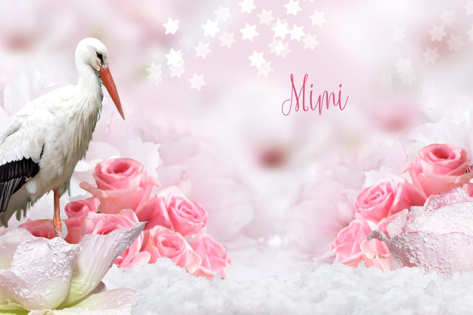 sprookjesgeboortekaartje met ooievaar sneeuw roze bloemen