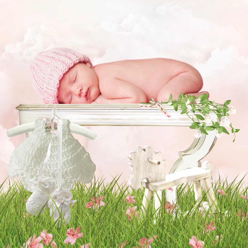 Een lief sprookjesgeboortekaartje voor een meisje met roze bloemen, houten hobbelpaardje, schattig babyjurkje en slofjes. Ook verkrijgbaar in blauw.