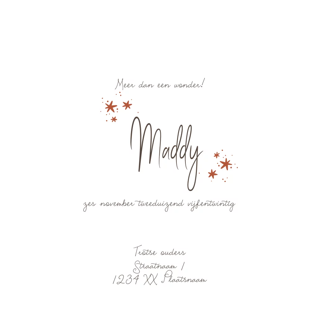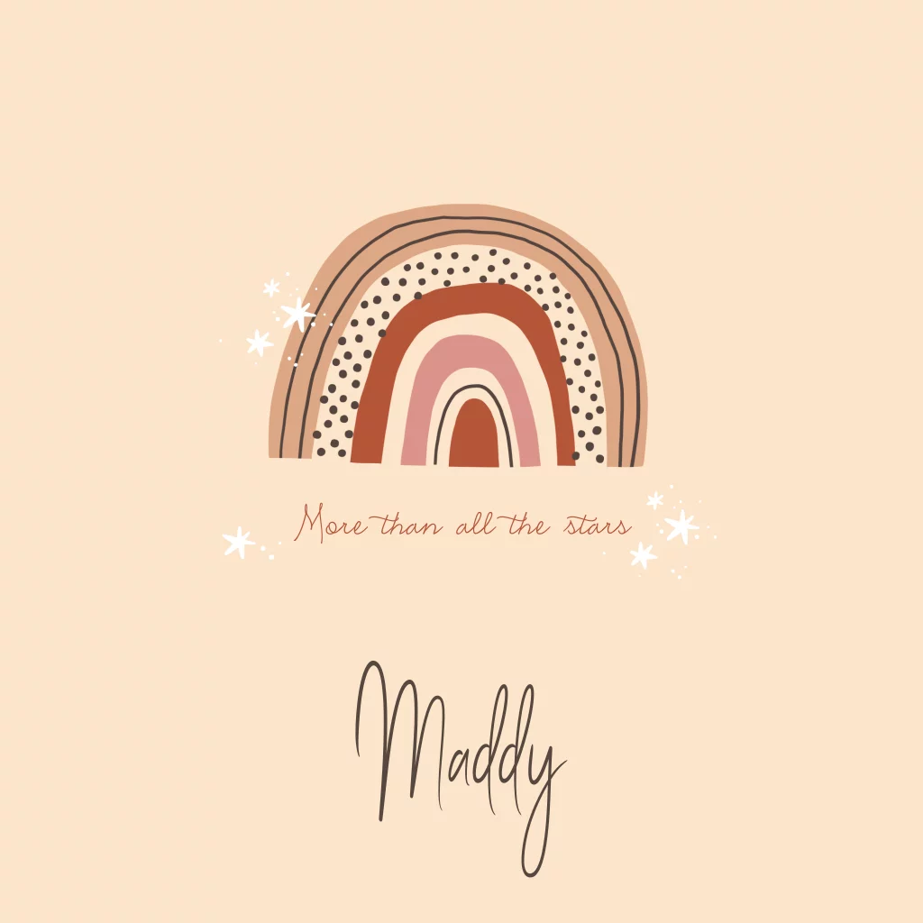 Een stoer geboortekaartje met een regenboog met stipjes en sterren. Voor zowel jongens als meisjes. Liever een andere kleur achtergrond? Dit kun je in de online editor gemakkelijk aanpassen.