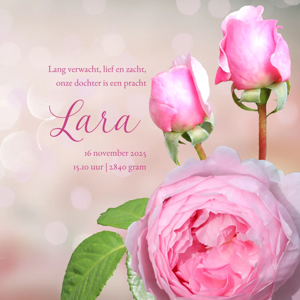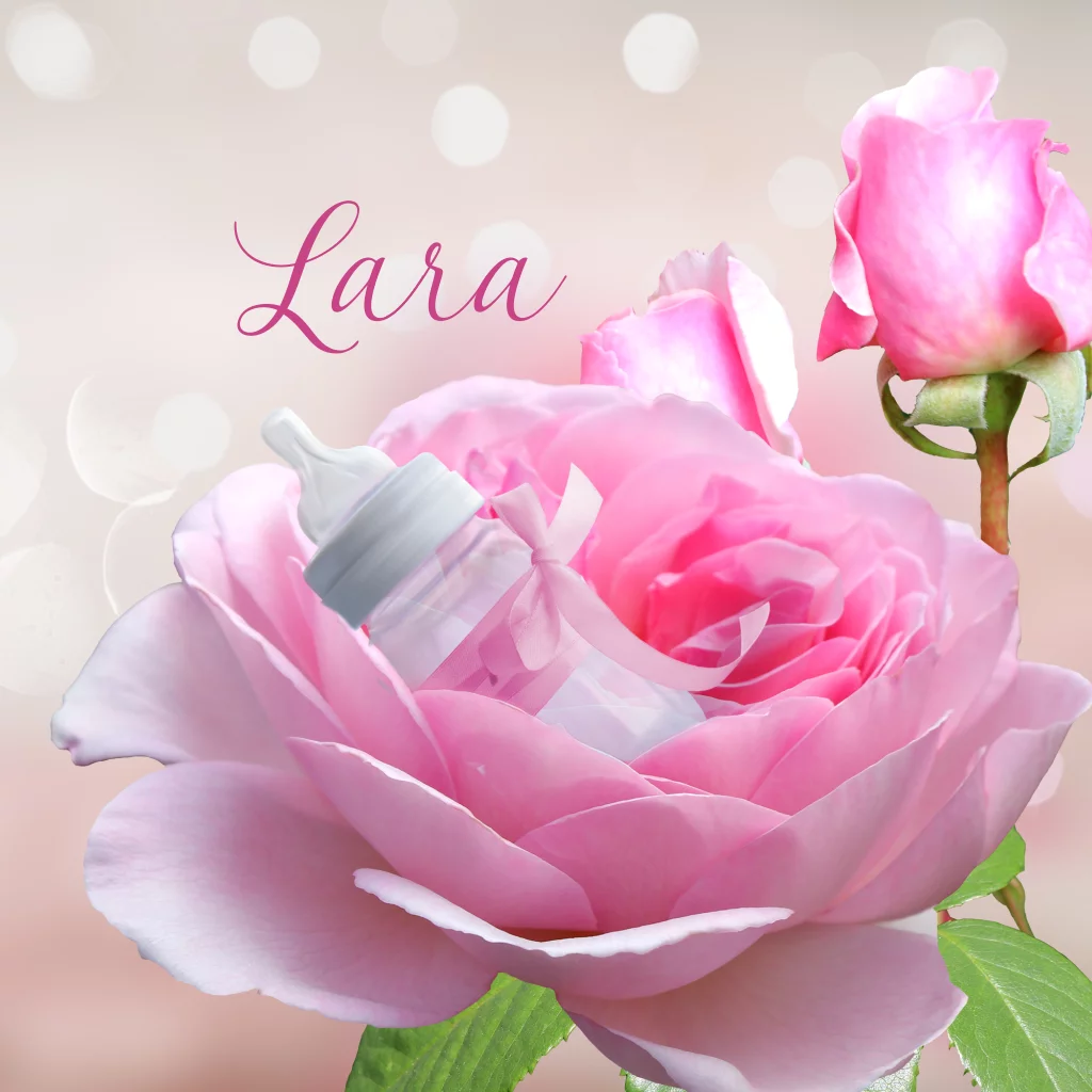 zoet sprookjesgeboortekaartje met babyfles in roze rozen