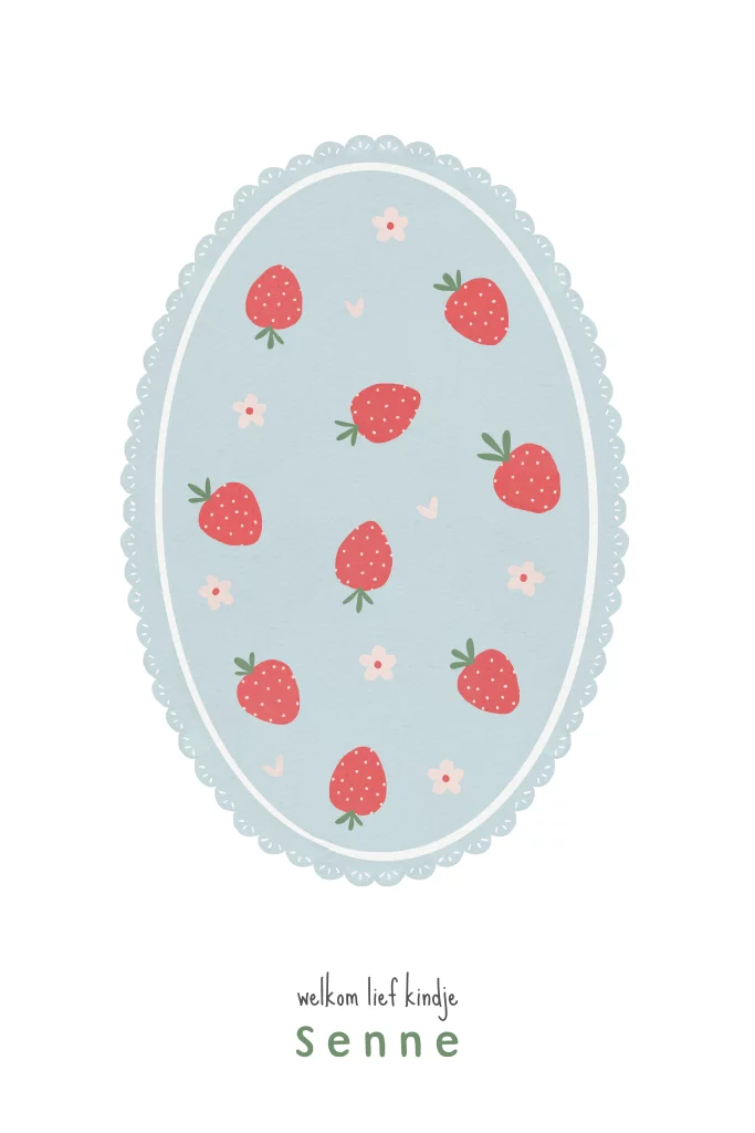 Een zomers geboortekaartje met illustraties van aardbeien en bloemetjes. Pas dit geboortekaartje naar wens aan in de online editor en bestel een proefdruk!