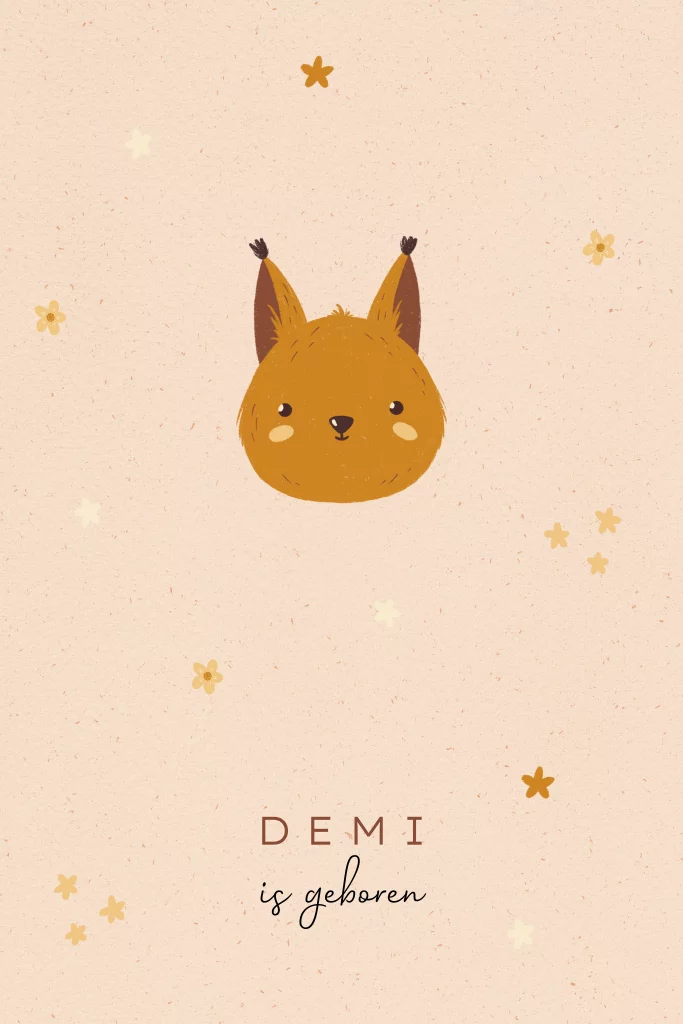Eenvoudig en lief geboortekaartje voor een jongen of meisje met een lief eekhoorntje en bloemetjes. Alles is nog helemaal aan te passen in de online editor zodat het geboortekaartje helemaal wordt zoals jij graag wilt. Je kunt dit ontwerp ook als kraambezoekboek bestellen.
