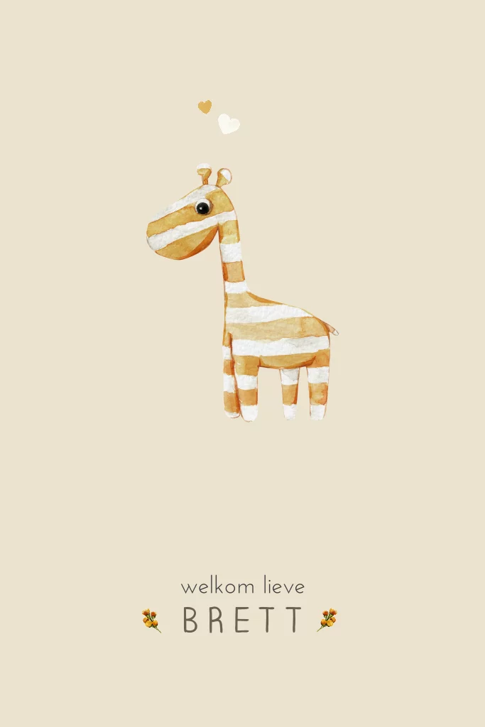 Lief geboortekaartje voor een jongen of meisje met schattige giraf speelgoedknuffel en hartjes in waterverf. Met de online editor kun je dit geboortekaartje helemaal naar wens aanpassen. Wist je dat je dit geboortekaartje ook direct door ons kunt laten versturen? Wij zorgen voor de adresstickers en geboortezegels en jullie kaartjes worden rechtstreeks verzonden naar familie en vrienden.