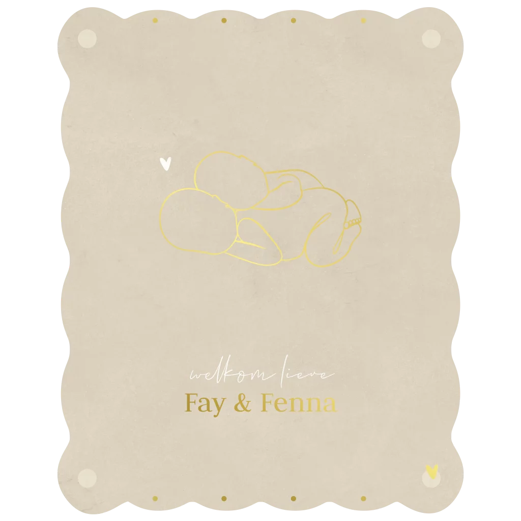 Geboortekaartje tweeling met lijntekening, foliedruk en golvende rand