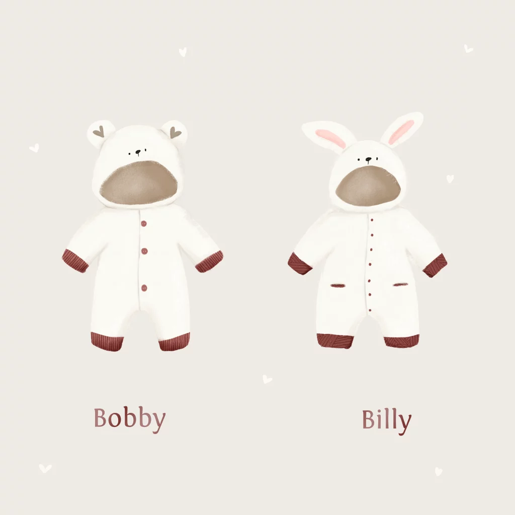 Tweeling geboortekaartje met babykleertjes beer en konijn