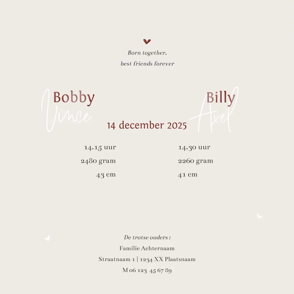 Dit schattige tweeling geboortekaartje met een winterthema is perfect voor de aankondiging van de geboorte van jouw twee kleintjes. Met lief berenpak en konijnenpak voor de koude wintermaanden. De namen en hartjes worden gedrukt in hoogglans.