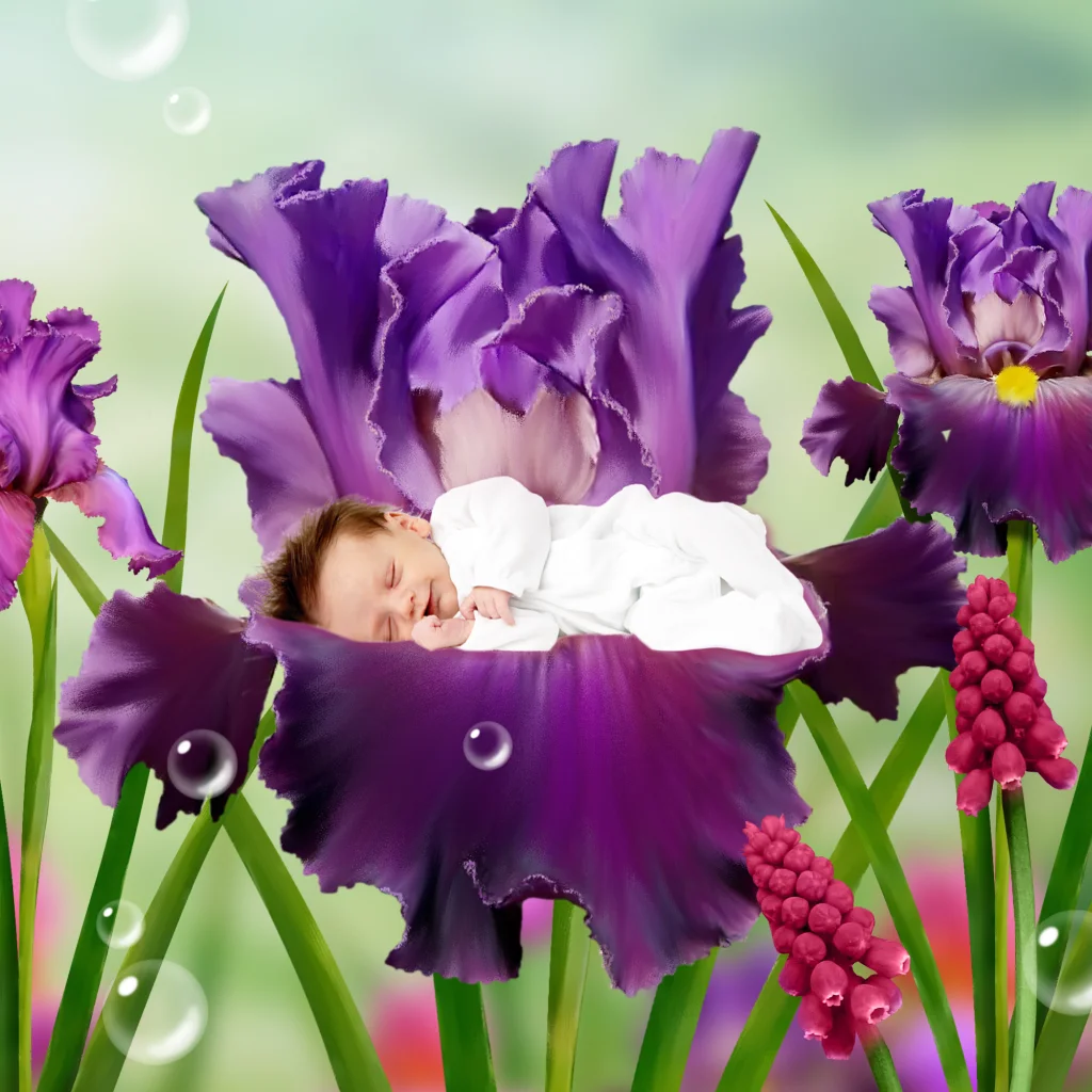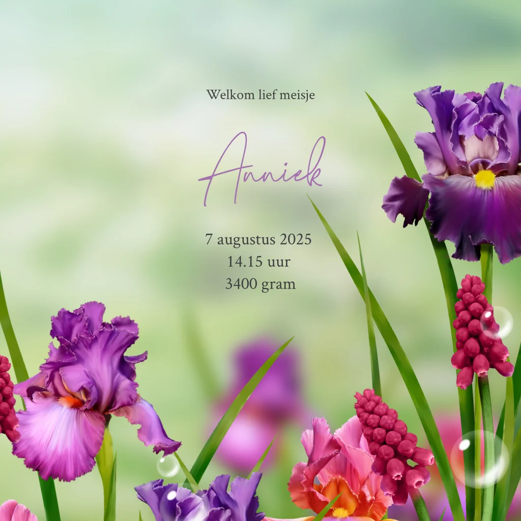 Een origineel sprookjesgeboortekaartje met foto van jullie baby in een paarse iris en roze bloemen. Met dit sprookjesachtige geboortekaartje kondig je de komst van jullie dochter op een heel unieke manier aan.