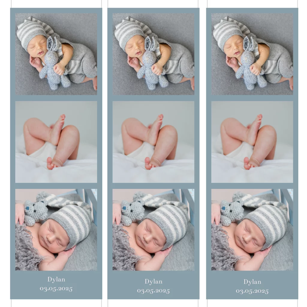 Leuke DIY fotostrip met drie fotootjes om toe te voegen aan je geboortekaartjes. Zo wordt het geboortekaartje nog persoonlijker. De kleur en het lettertype is eenvoudig aan te passen.