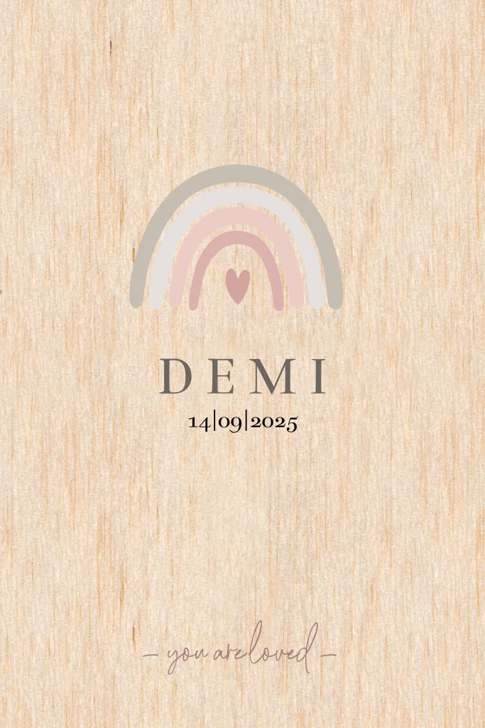 Echt houten geboortekaartje meisje regenboog roze grijs