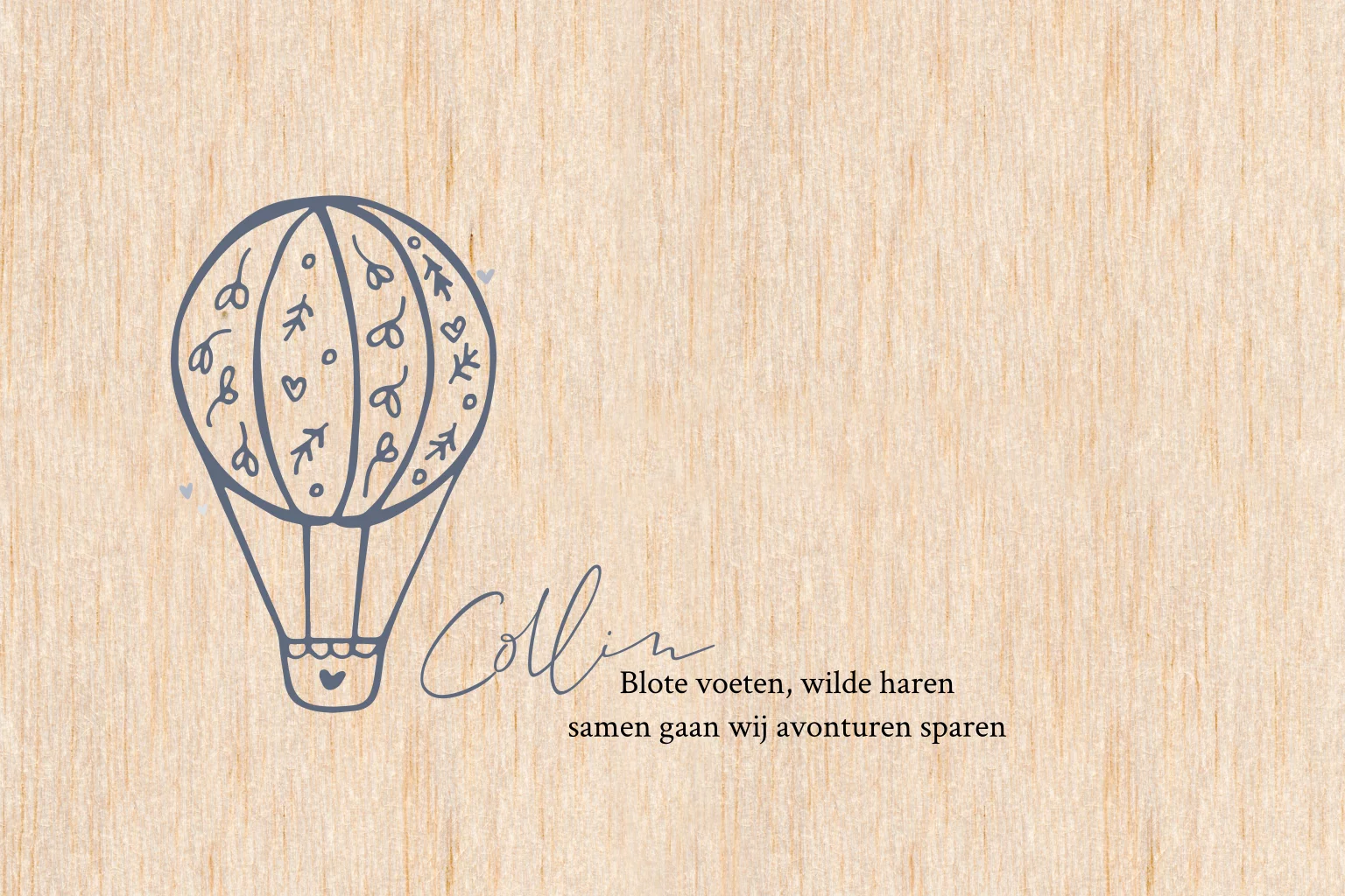 Een lief geboortekaartje op echt hout met tekening van een luchtballon met hartjes. Leuk voor zowel jongens als meisjes. Pas het geboortekaartje in de online editor aan naar jullie wensen.