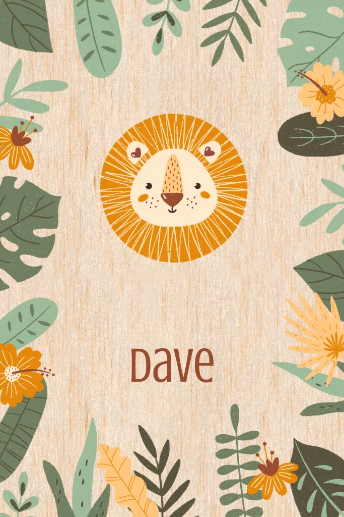 Houten geboortekaartje met lief leeuwtje en jungle bladeren