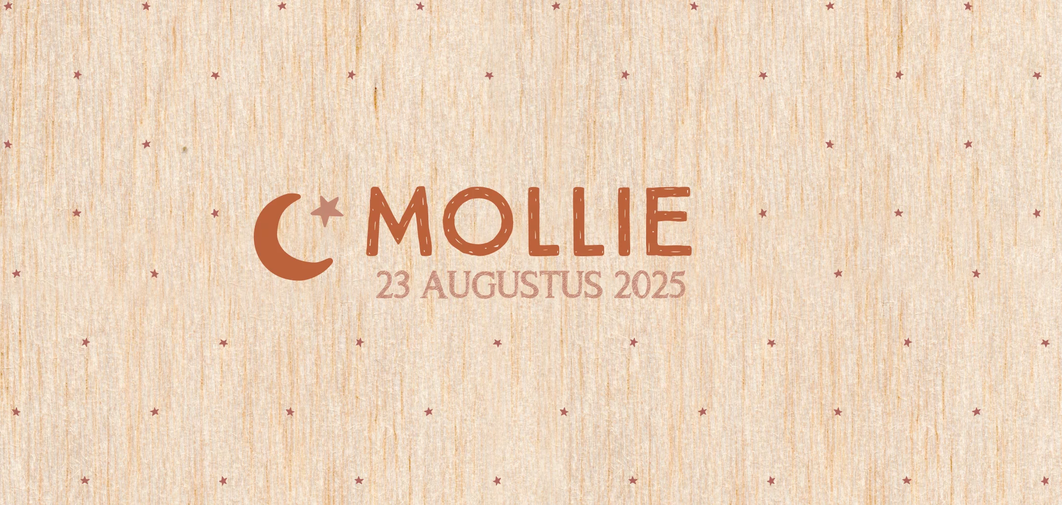 Een mooi houten geboortekaartje met maantjes en sterretjes. De kleuren kun je eenvoudig aanpassen in de online editor zodat het geboortekaartje helemaal bij jullie past.