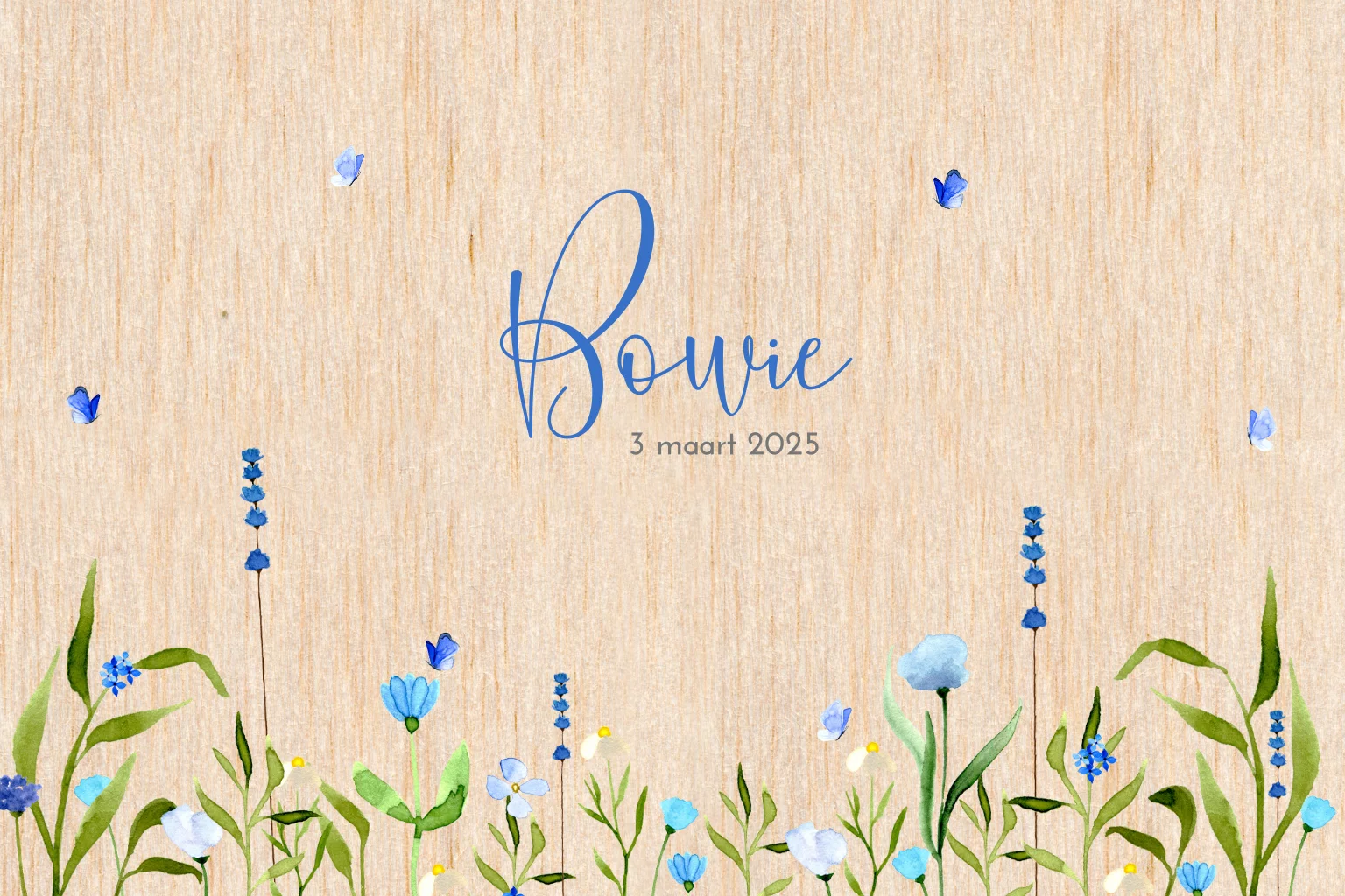 Een lief geboortekaartje op hout met blauwe bloemen in waterverf. Leuk voor zowel jongens als meisjes. De vlindertjes kun je verplaatsen of weghalen.