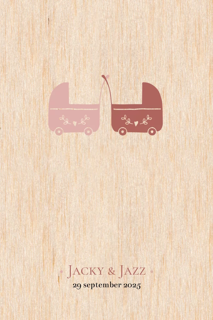 Een lief houten geboortekaartje voor een tweeling met leuke illustratie van twee kinderwagens met hartjes.