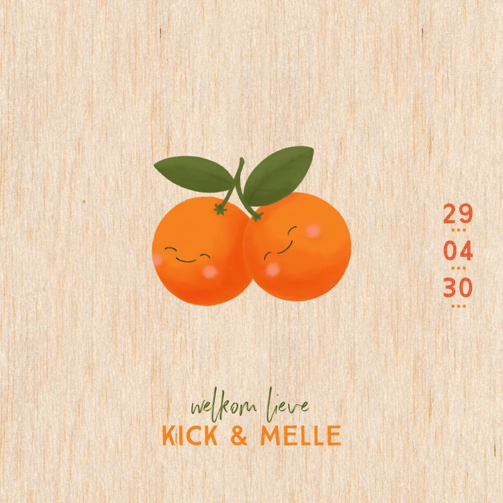 Vrolijk geboortekaartje voor een tweeling met twee sinaasappels gedrukt op echt hout. Je kunt door middel van de handige editor het kaartje voor jullie tweeling naar wens aanpassen.