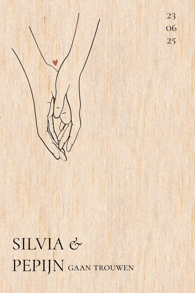 Trouwkaart op hout met illustratie lijntekening handen