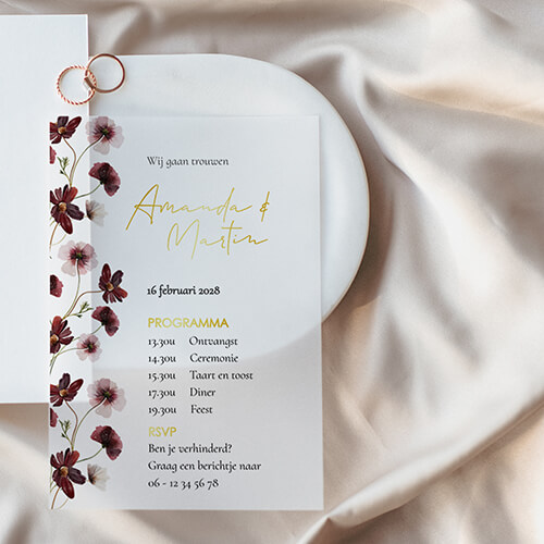 Deze romantische trouwkaart met rode en roze bloemen is gedrukt op luxe calco papier. Je kunt deze trouwkaart zelf naar wens aanpassen. Kom je er niet uit of heb je vragen? Neem dan contact met ons op. We helpen je graag.