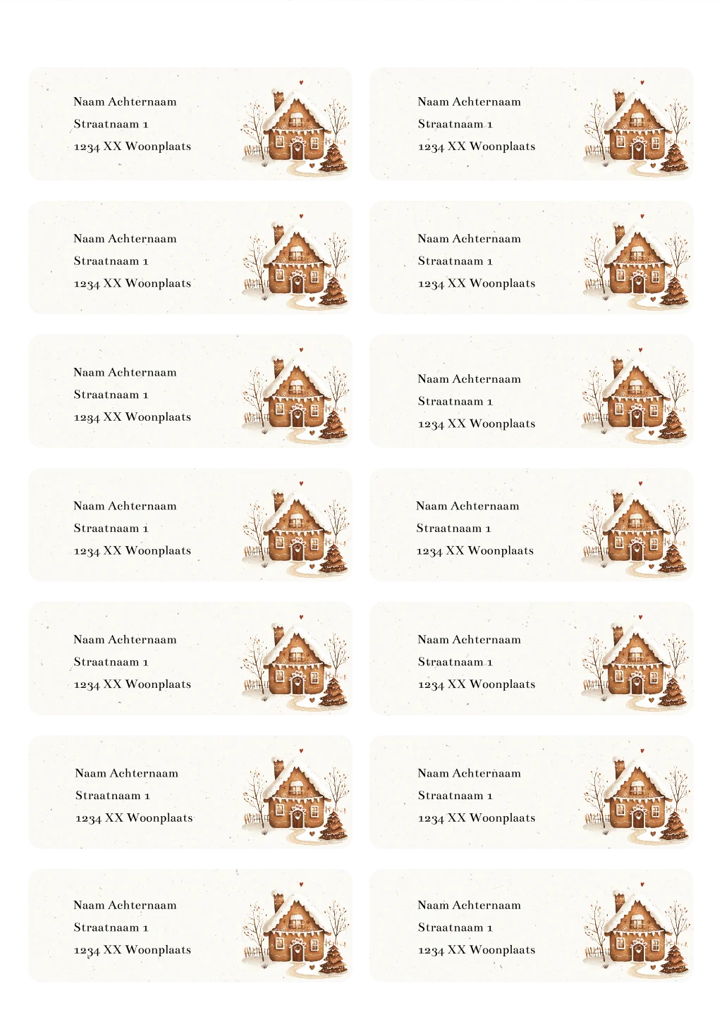 Met deze schattige adresstickers met het peperkoekhuisje voeg je een persoonlijk tintje toe aan je kerstpost. Je kunt het design zelf aanpassen en de adressen invullen.