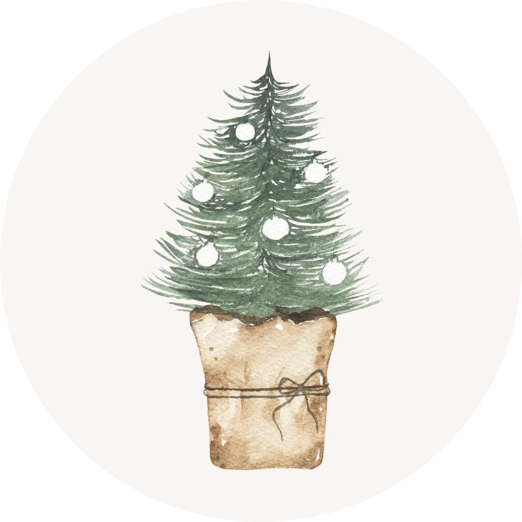 Mooie, naturel sluitzegel om jullie kerstkaarten mee dicht te plakken of om kerstcadeaus mee te versieren. Met waterverf illustratie van een kerstboom in een mand. Mooi te combineren met de bijpassende kerstkaart.