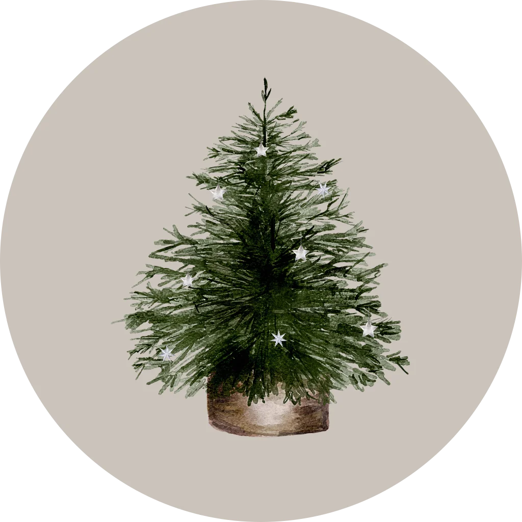 Naturel sticker met kerstboom met witte sterren. Mooi te combineren met de bijpassende kerstkaart maar ook leuk om kerstcadeaus mee te versieren.