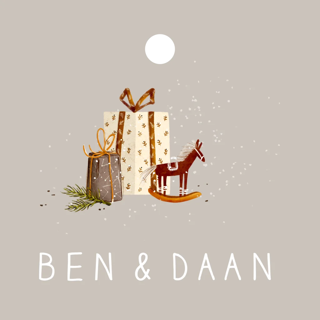 Dit label met illustratie van kerstcadeautjes en een lief hobbelpaardje is leuk om jullie kerstkaarten of cadeaus mee te versieren. Pas de namen eenvoudig aan. Het bevestigingsmateriaal kun je los bestellen en vind je bij de Extra producen.