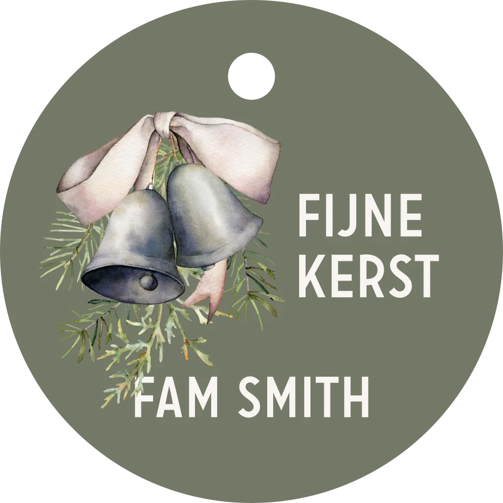 Rond kerstlabel met jullie naam en illustratie kerstbellen en takjes. Bewerk het labeltje in de editor zodat het helemaal naar jouw wens is.