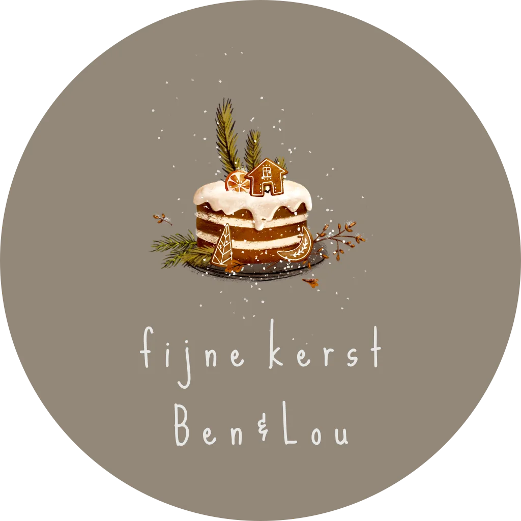 Ronde sticker met naam en illustratie van een taart met kerstversiering.