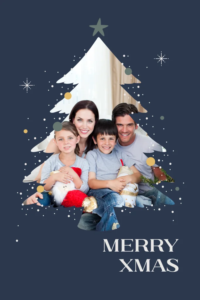 Een feestelijke kerstkaart waarin jouw foto schittert in de vorm van een kerstboom. Een warme en persoonlijke manier om familie en vrienden fijne feestdagen te wensen. Pas de tekst en achtergrond eenvoudig aan in de editor en voeg op de achterzijde je eigen kerstgroet toe.