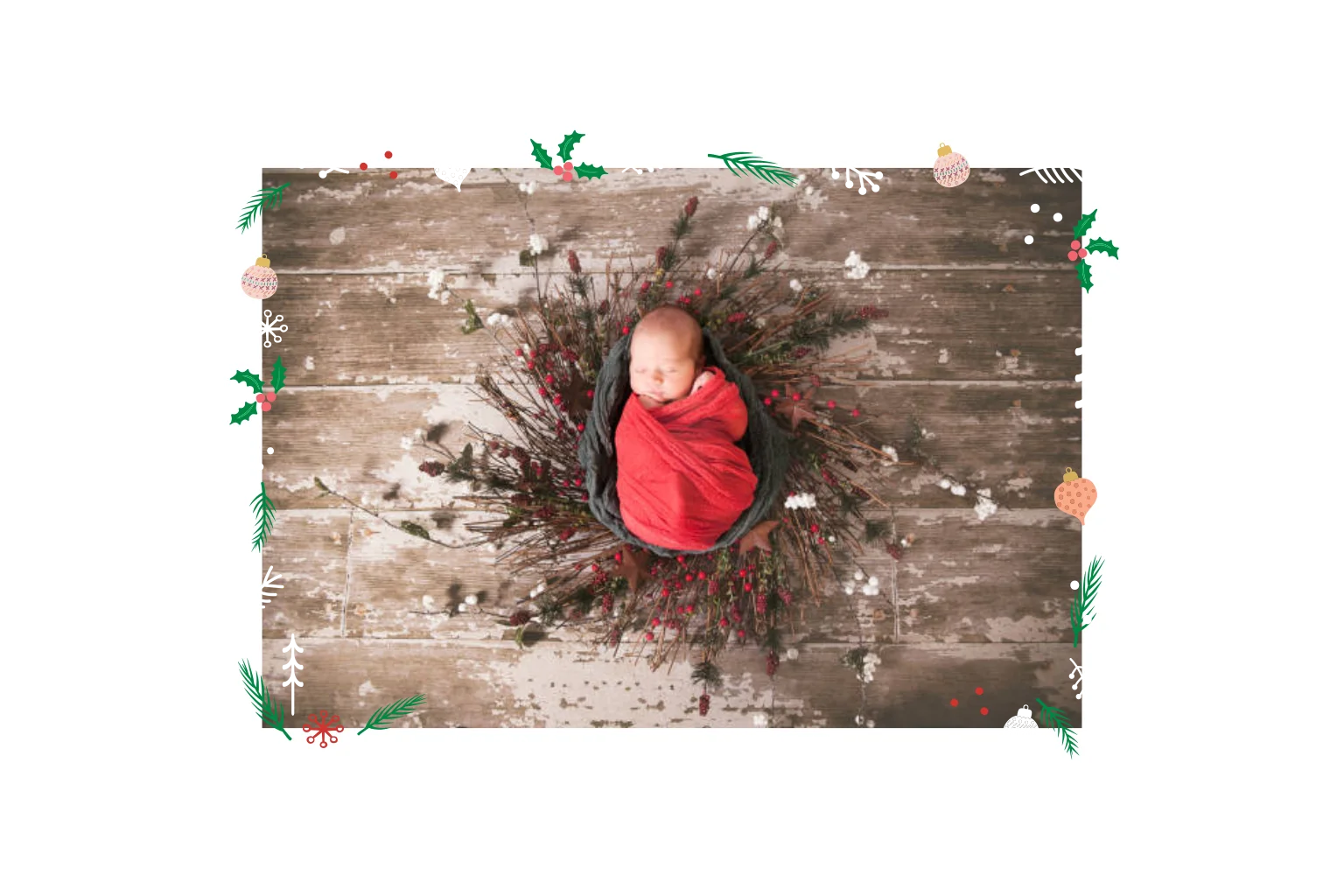 Een sfeervolle kerstkaart met eigen foto, omringd door dennentakjes, hulst en kleine kerstillustraties in warme kleuren. De afgeronde hoeken geven het kaartje een zachte, moderne uitstraling. Voeg eenvoudig je eigen foto toe en maak er een persoonlijke en feestelijke kerstgroet van.