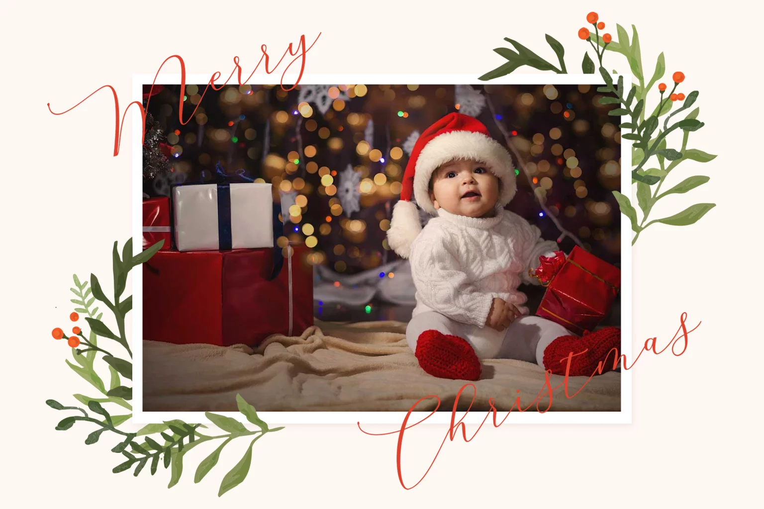 Een lieve en sfeervolle kerstkaart met jouw eigen foto op de voorkant. De groene takjes en rode besjes geven het ontwerp een natuurlijke, feestelijke uitstraling. Pas eenvoudig de achtergrondkleur, tekst en lettertypes aan zodat de kaart perfect bij jouw foto past. Voeg een persoonlijke kerstwens toe aan de binnenzijde en maak er een uniek en hartverwarmend kaartje van.
