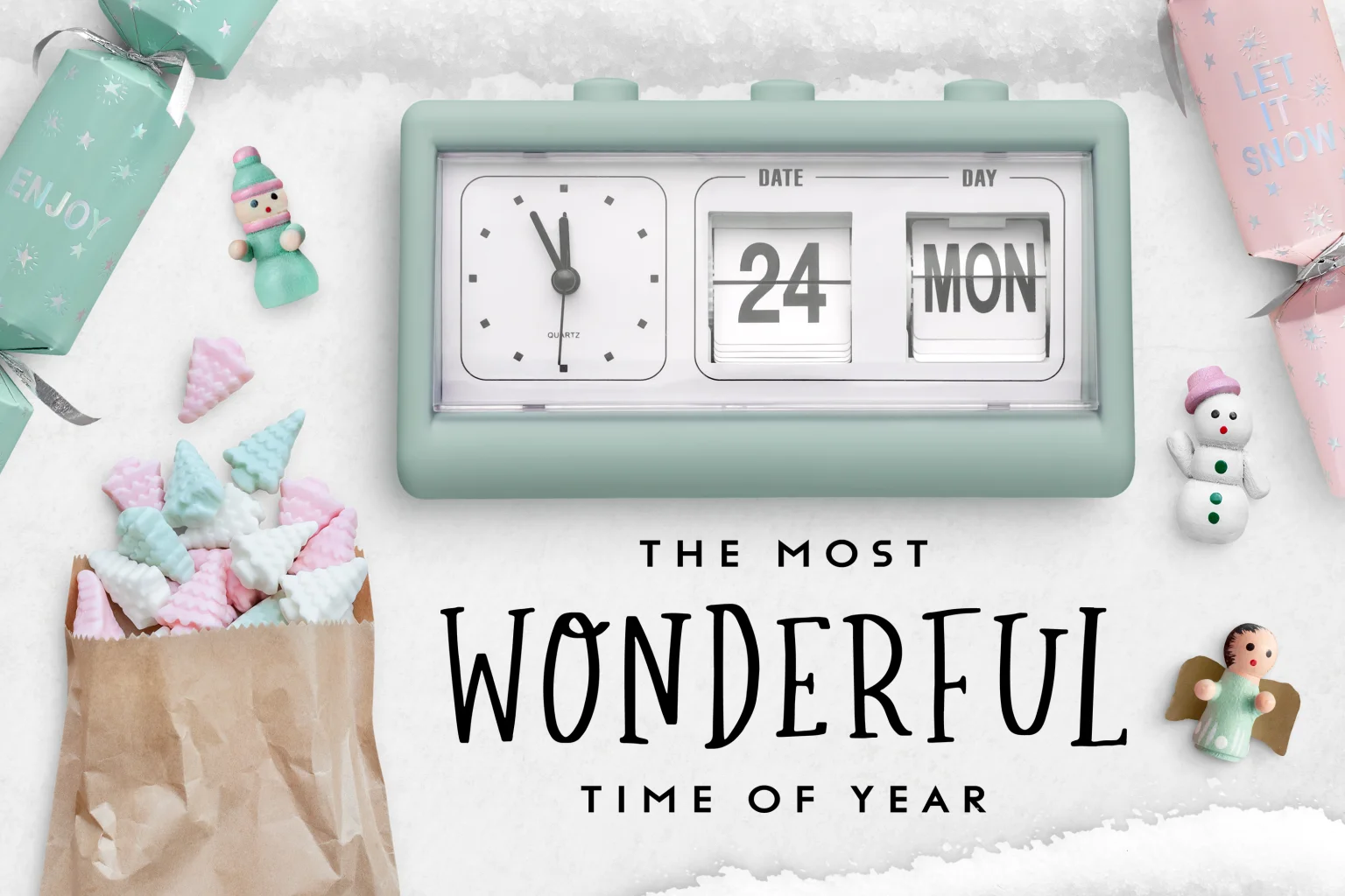 Als je niet van standaard kerstkaarten houdt dan is deze originele sprookjes kerstkaart perfect voor jullie. Deze kerstkaart zal zeker opvallen bij jullie vrienden en familie. In mintgroen en roze met op de voorzijde de wekker tot de kerstdagen, ingepakte cadeautjes en kerstsnoepjes en de tekst The most wonderful time of year.