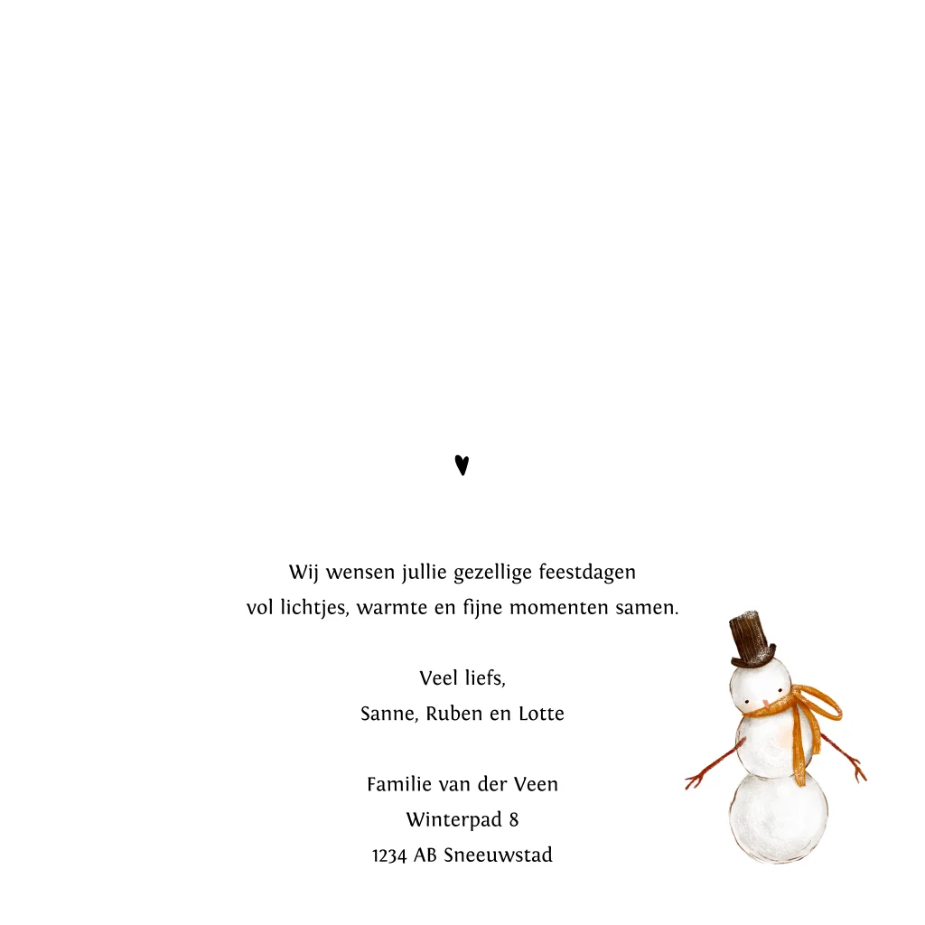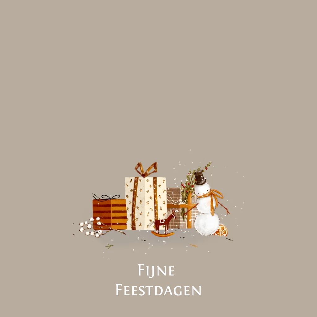 Een sfeervolle dubbele kerstkaart met cadeautjes, een vrolijke sneeuwpop en de tekst Fijne Feestdagen in goudfolie. De zachte tinten en warme details geven de kaart een charmante, winterse uitstraling. Binnenin is ruimte voor een persoonlijke kerstgroet en namen, zodat je kaart écht eigen wordt.